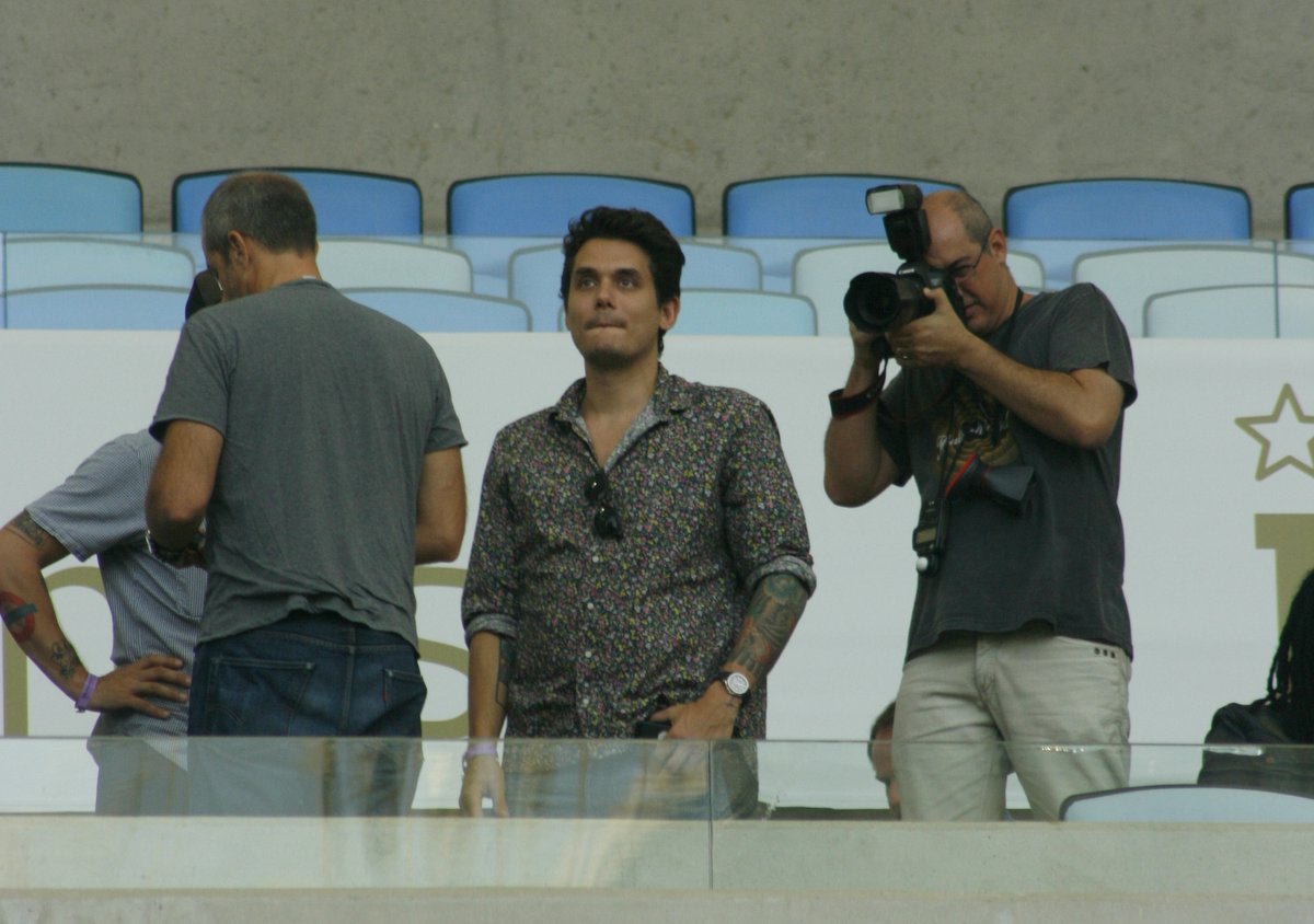 John Mayer aproveitou o domingo (22) para curtir um pouco mais o Brasil. Depois de tocar em São Paulo e em seguida ser uma das atrações mais aguardadas no Rock in Rio no sábado (21), o cantor americano decidiu assistir ao jogo de Botafogo e Bahia, no estádio do Maracanã.