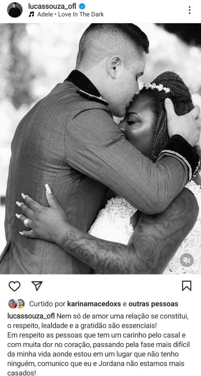 Na rede social, o militar publicou que não está mais com Jojo. "Nem só de amor uma relação se constitui, o respeito, lealdade e a gratidão são essenciais. Em respeito às pessoas que tem um carinho pelo casal e com muita dor no coração, passando pela fase mais difícil da minha vida onde estou em um lugar que não tenho ninguém, comunico que eu e Jordana não estamos mais casados!", escreveu Lucas.