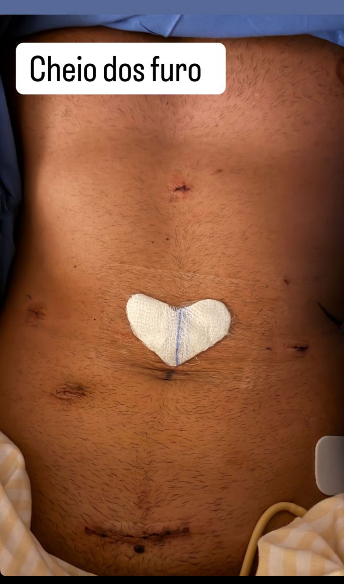 O influenciador também mostrou as marcas da cirurgia. "Já vi todo tipo de série, estou aqui ainda [internado]. Monitorando o dreno, fica saindo esse líquido a noite inteira, sangue. Mas estou aqui", relatou.