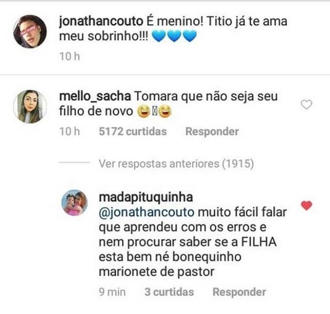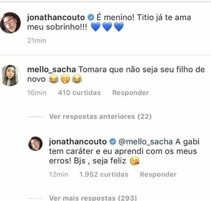 “É menino! Titio já te ama meu sobrinho!”, escreveu Jonathan. Uma internauta então comentou: “Tomara que não seja seu filho de novo”.