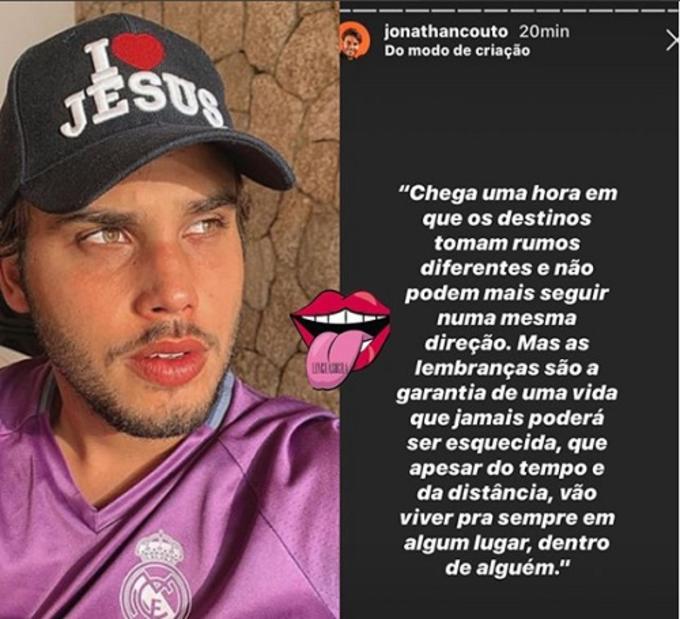 O influencer Jonathan Couto, marido de Sarah Poncio, postou um texto enigmático nos stories de seu Instagram, durante a madrugada desta quinta-feira (11) que deixou os fãs eufóricos. Poucos minutos depois, ele apagou a publicação.