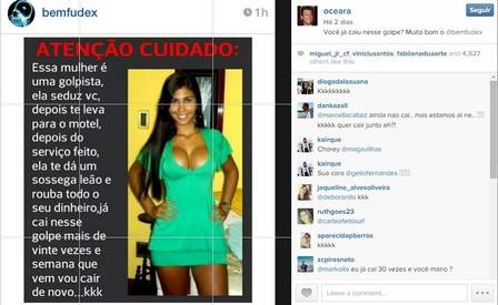 "Isso nunca tinha acontecido antes. Fiquei sabendo através de uma amiga que seguia o Ceará. Ela viu e falou comigo que a minha foto estava lá com dizeres muito maldosos. Quando entrei no perfil dele, levei um susto. Falei com o meu marido e no dia seguinte fui na 126ª DP (Cabo Frio) e abri um boletim de ocorrência", disse Letícia, que conta que a foto usada na montagem é antiga. "A foto é antiga, de uns cinco anos atrás. Eu nunca tinha visto essa montagem. Abri um boletim de ocorrência e agora ele vai ser chamado pra depor. Vou entrar com um processo contra ele por danos morais", disse.