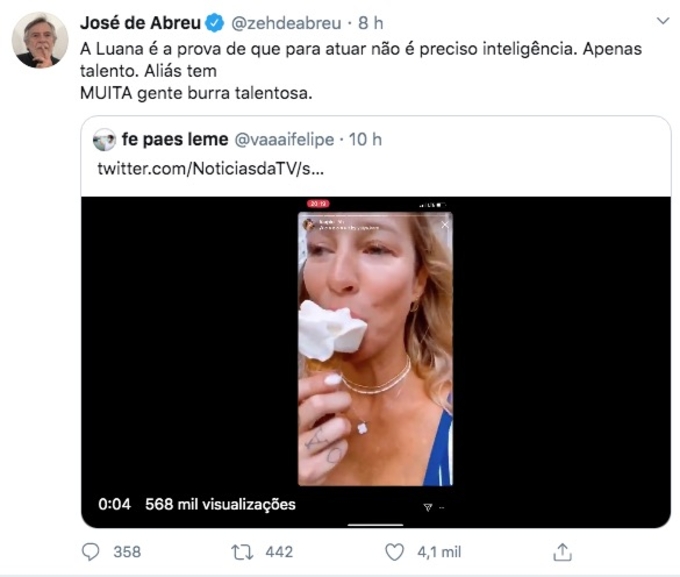 Na legenda da publicação Abreu escreveu: “A Luana é a prova de que para atuar não é preciso inteligência. Apenas talento. Aliás tem MUITA gente burra talentosa”, disparou José de Abreu em seu Twitter.