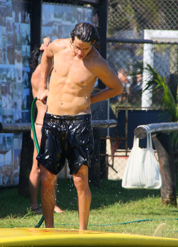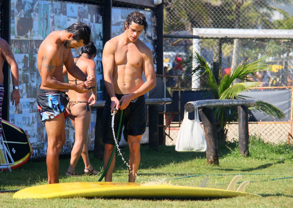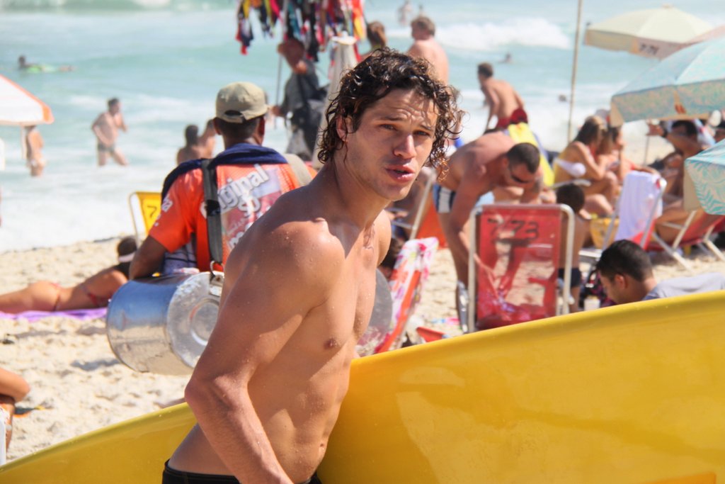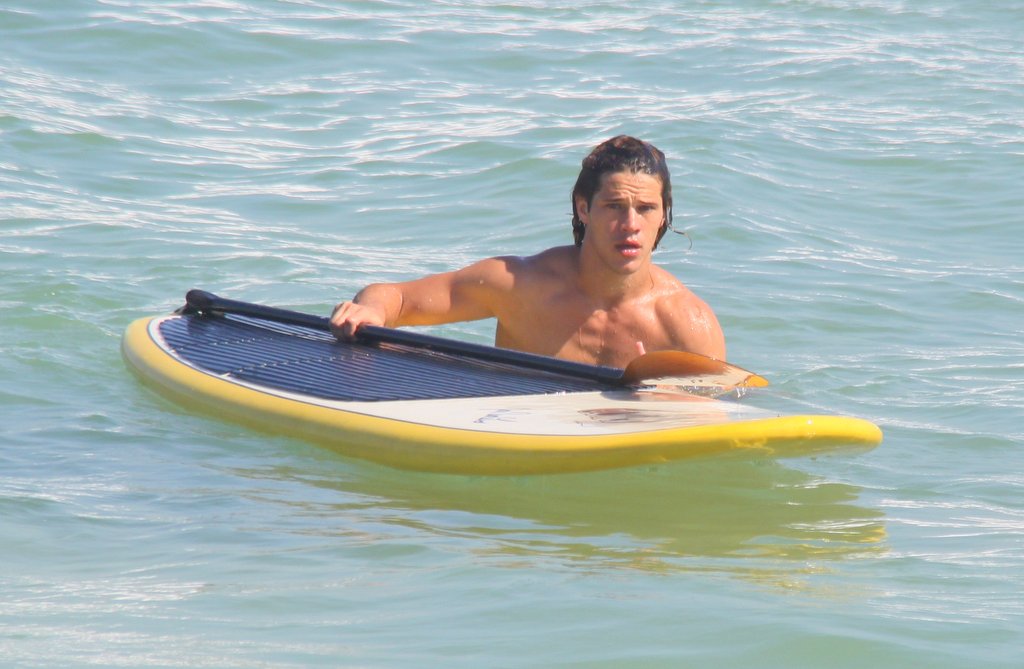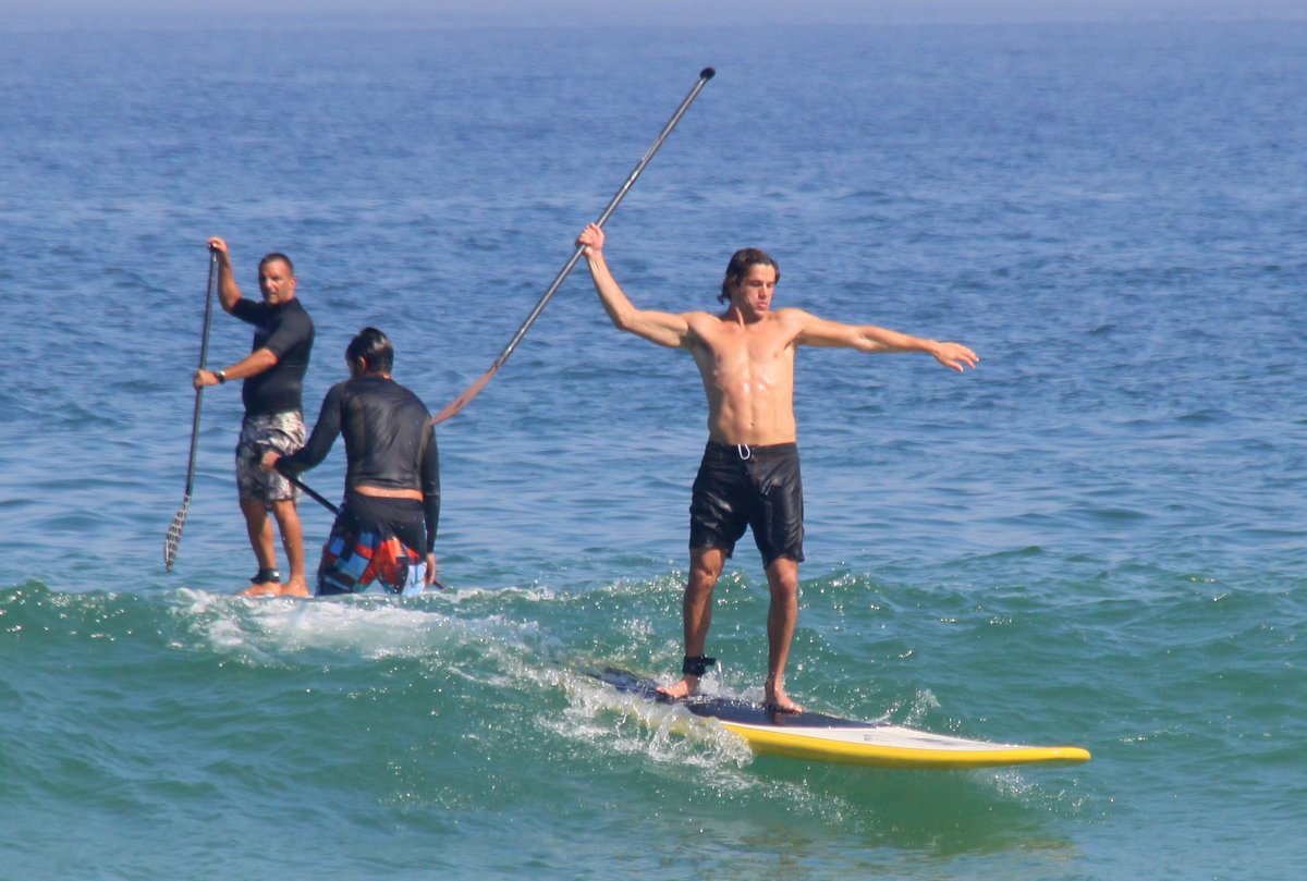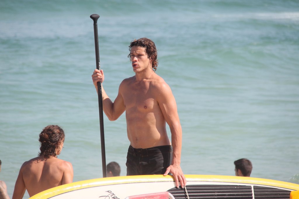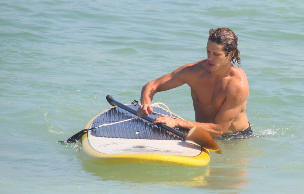 José Loreto tirou uma folga das gravações de 'Flor do Caribe' e aproveitou para praticar 'Stand up paddle' na Praia da Barra da Tijuca, no Rio de Janeiro. Simpático, o namorado de Débora Nascimento ainda posou com uma fã.