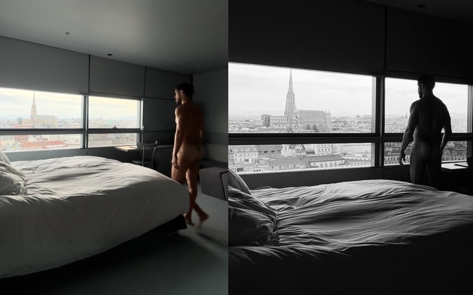 O ator posou completamente nu no quarto do hotel, deixando à mostra o bumbum. "A saudade é o azar de quem teve muita sorte? Boa noite, Viena", legendou ele, mas o que realmente chamou a atenção dos seguidores foram as imagens ousadas.