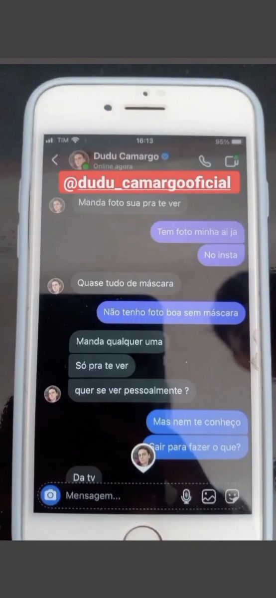 “Eu não sei se vocês conhecem o Dudu Camargo, aquele apresentador do SBT. Se não conhecem, vão conhecer agora. Ele gosta de mandar mensagens pra criança, para menor de idade. Ele mandou mensagem hoje para o meu irmão, meu irmão tem 13 anos”, disse Eduarda em um vídeo postado em seu perfil do Instagram.