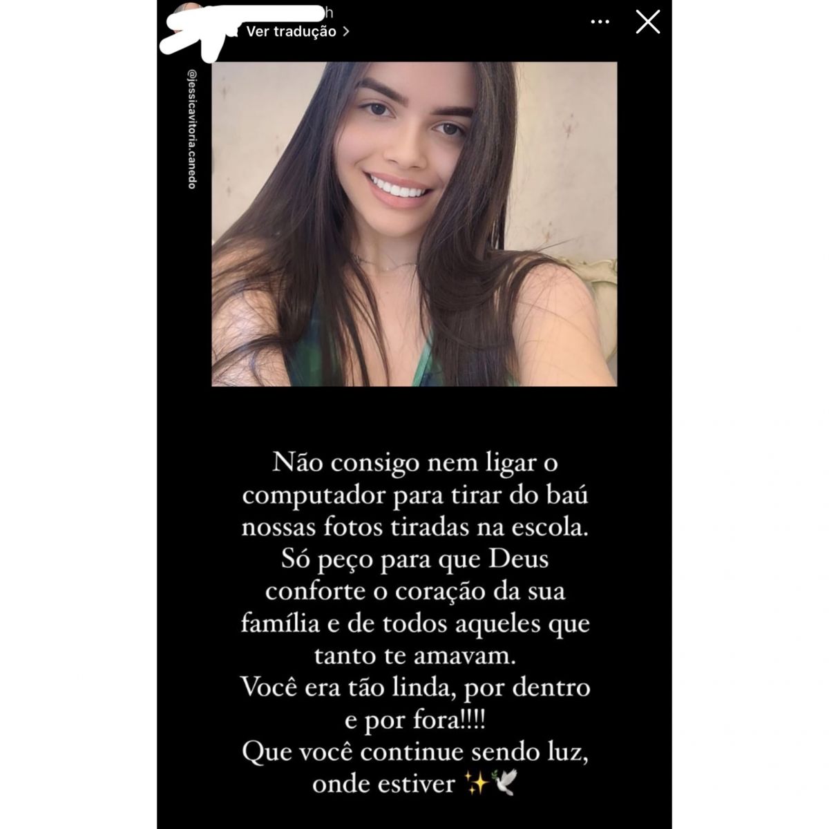 Um post da amiga de Jéssica, Vitória Santos, lamenta o falecimento: "Infelizmente perdi uma amiga, por conta de mentiras, por conta de ataques na rede social. Amiga, que Deus te dê um bom lugar. Descanse em paz", escreveu ela.
