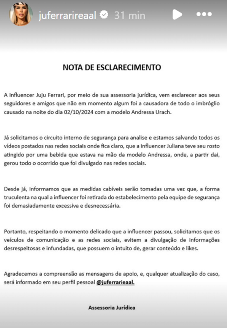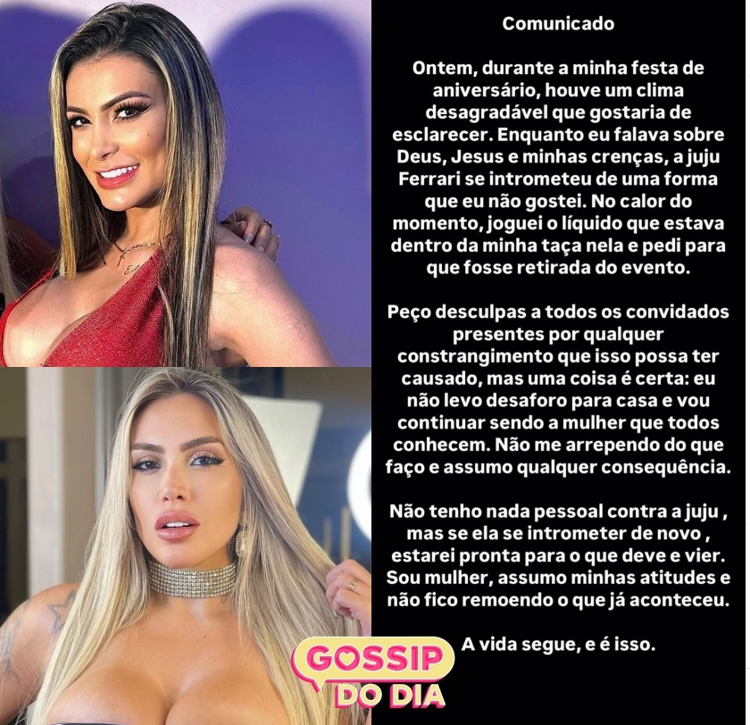 Juju Ferrari deu uma versão diferente da de Andressa Urach sobre o motivo do barraco entre as duas na festa de aniversário da gaúcha.