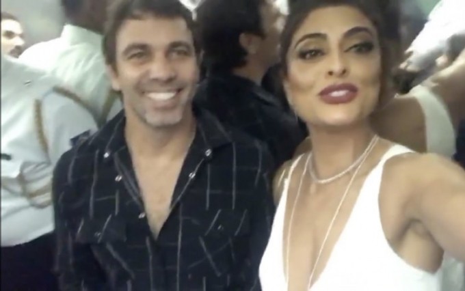 Antes de chegar ao evento, a atriz ficou presa no elevador junto com o ator Marcelo Faria. Juliana registrou tudo e publicou nas redes sociais.