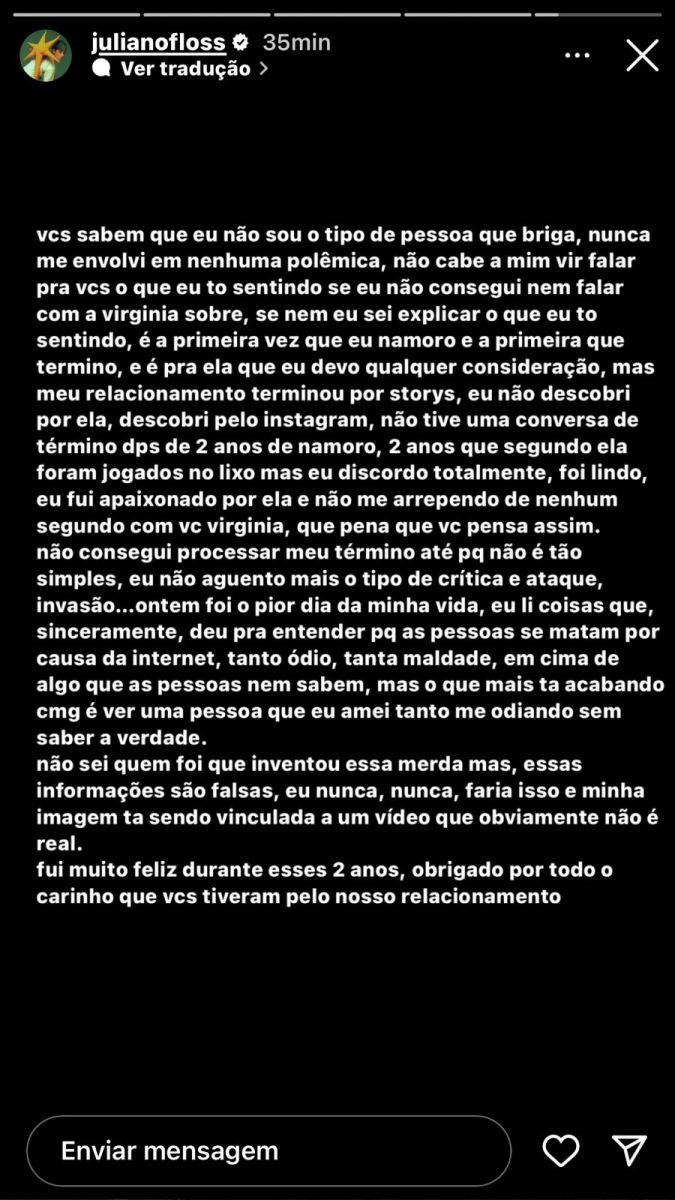 O rapaz disse que ficou sabendo do término com Vivi pelos stories do Instagram, e que ao contrário do que a cantora afirma, ele não acredita que o relacionamento tenha sido tempo jogado fora.
