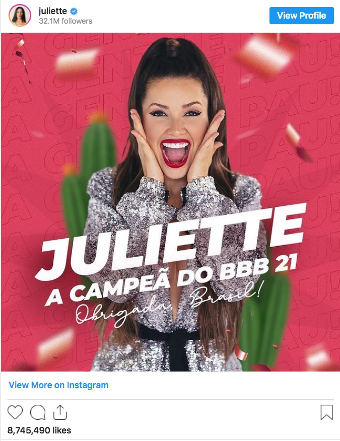 “Juliette se tornou uma sensação durante seu tempo no Big Brother Brasil. Foi seu post no Instagram anunciando que ela havia vencido a 21ª temporada que quebrou esse recorde”, diz a nota do Guinness.