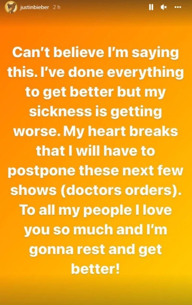 Nos stories do Instagram, Justin escreveu: "Não acredito que estou dizendo isso. Eu já fiz de tudo para melhorar, mas a minha doença está piorando. Meu coração se quebra ao saber que preciso adiar esses próximos shows (ordens médicas). Para todos meus fãs, eu amo muito vocês e vou descansar e ficar bem".