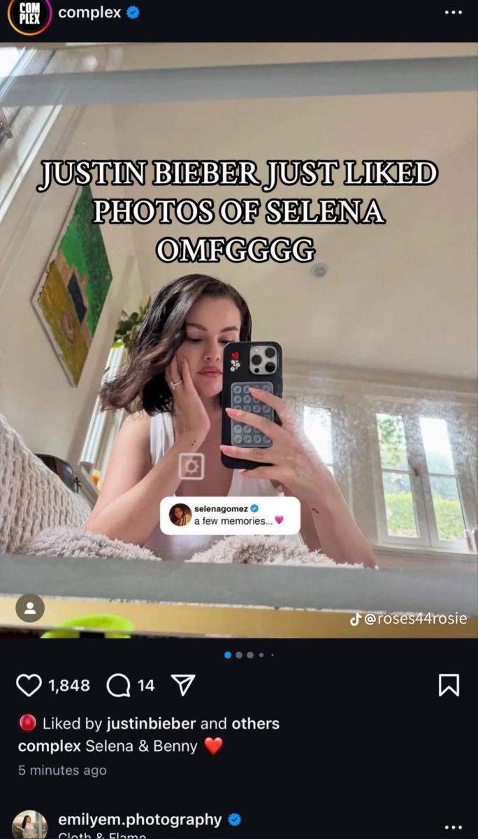 Justin Bieber deixou escapar uma curtida em um post de Selena Gomez no Instagram, que incluía fotos da cantora ao lado de seu atual noivo, Benny Blanco — ex-amigo de Bieber. A publicação era do perfil da revista americana Complex e, embora o cantor tenha retirado a curtida rapidamente, o flagra não passou despercebido pelos fãs, que registraram o momento e viralizaram a imagem nas redes sociais.