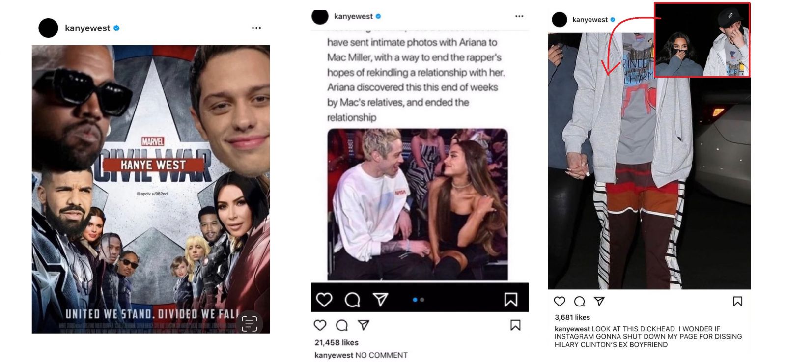 Ele compartilhou uma montagem do pôster de “Capitão América: Guerra Civil”; De um lado ele está com Drake, Julia Fox (sua namorada), Travis Scott e Future. Do outro, aparecem Pete Davidson, Kim Kardashian, Kid Cudi, Billie Eilish e Taylor Swift. Kanye também postou uma foto de Kim com Pete e xingou o comediante do Saturday Night Live de “cabeça de p*roca” e o chamou de “ex-namorado de Hillary Clinton”, postando uma foto da tatuagem que Pete tem da ex-candidata à presidência.
