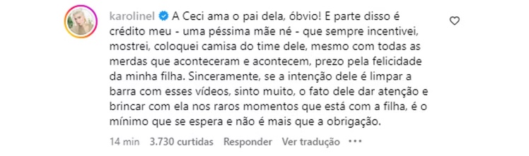 No Instagram, Karol comentou sobre a relação dos dois e a possibilidade de Éder estar tentando usar a imagem da filha para 'limpar' a própria 'barra'. "A Ceci ama o pai dela, óbvio! E parte disso é crédito meu, uma péssima mãe, né? - que sempre incentivei, mostrei, coloquei camisa do time dele, mesmo com todas as m*rdas que aconteceram e acontecem, prezo pela felicidade da minha filha. Sinceramente, se a intenção dele é limpar a barra com esses vídeos, sinto muito, o fato dele dar atenção e brincar com ela, nos raros momentos que está com a filha, é o mínimo que se espera e não é mais que a obrigação", escreveu ela.