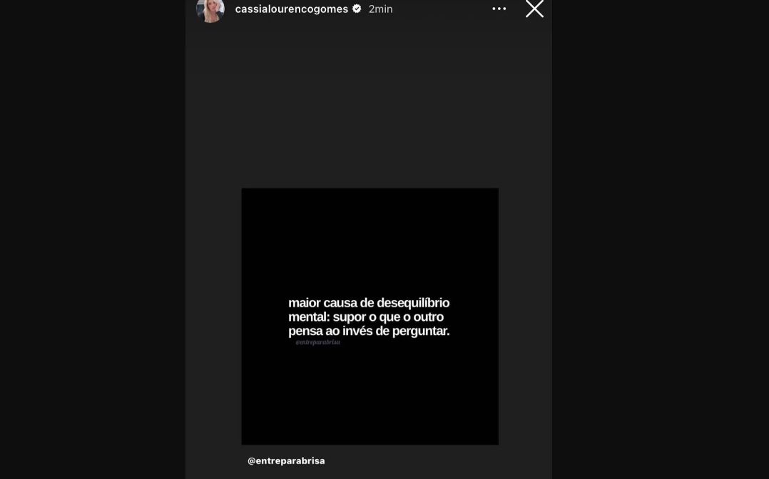 "Maior causa de desequilíbrio mental: Supor o que o outro pensa ao invés de perguntar", compartilhou Cássia a frase no Instagram, para logo depois apagar o post.