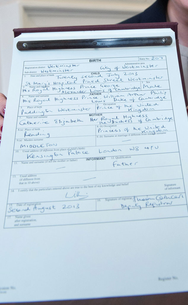 “O duque e a duquesa de Cambridge registraram oficialmente o nascimento de príncipe George. O duque e a duquesa de Cambridge assinaram o registro no Palácio de Kensington, esta manhã, testemunhado por um secretário do Cartório de Westminster” disse um comunicado oficial da realeza.