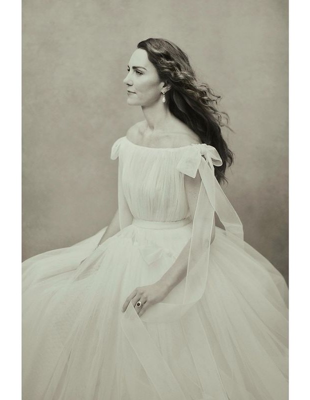 Em outro clique em preto e branco, ela aparece com brincos de diamante e pérola que pertenceram à princesa Diana, sua sogra, falecida em 1997. Outra joia que chama atenção é o anel de noivado de safira, peça icônica da realeza.