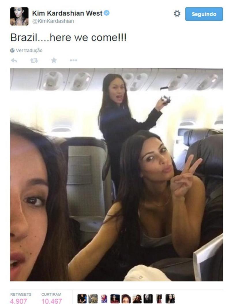 A beldade está ao Brasil para o lançamento da coleção em parceria com uma loja de roupas. Na segunda-feira (11), Kim participará de uma entrevista coletiva em um shopping de São Paulo.