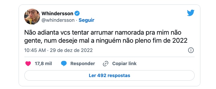 Porém, nesta quinta-feira, 29, Whindersson negou que esteja namorando em uma publicação no Twitter. “Não adianta ‘vcs’ ‘tentar’ arrumar namorada pra mim não gente, ‘num’ deseje mal a ninguém não pleno fim de 2022″, escreveu. Também nesta semana, circulou o boato de que ele estaria em um relacionamento com Lorena Maria, empresária proprietária da marca BadGall.