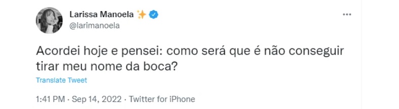 “Acordei hoje e pensei: como será que é não conseguir tirar meu nome da boca?”, disparou a atriz e cantora no Twitter.