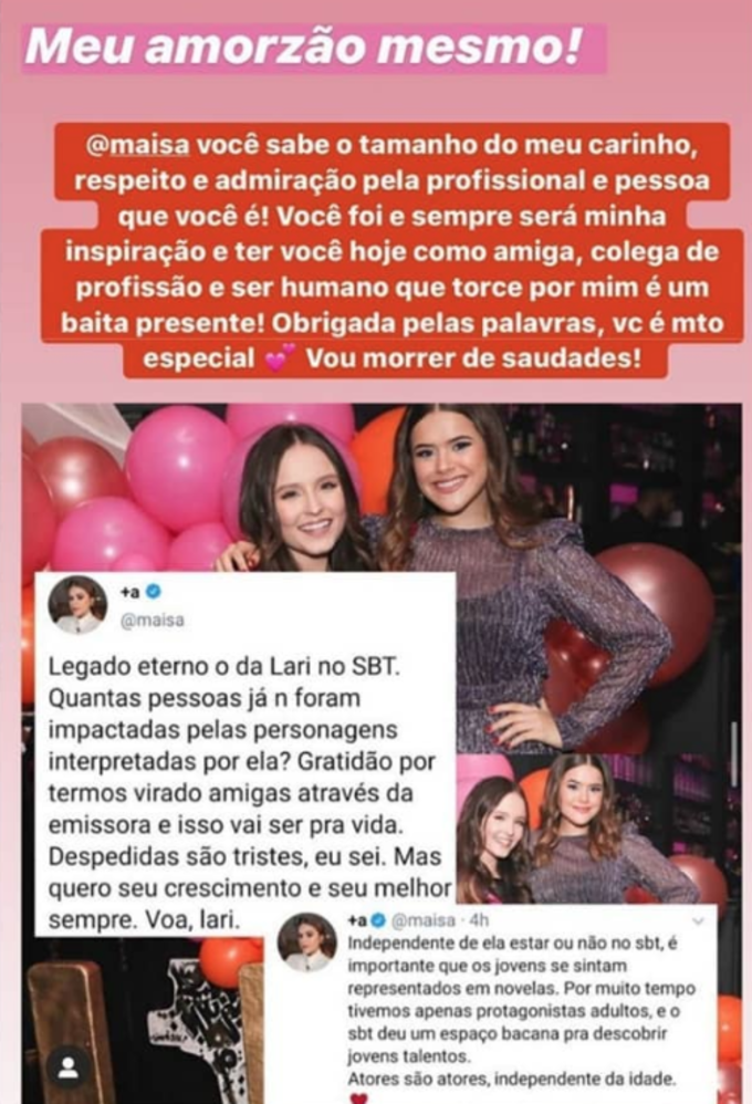 "Legado eterno o da Lari no SBT. Quantas pessoas já não foram impactadas pelas personagens interpretadas por ela? Gratidão por termos virado amigas através da emissora e isso vai ser pra vida. Despedidas são tristes, eu sei. Mas quero seu crescimento e seu melhor sempre. Voa, Lari", disse ela.