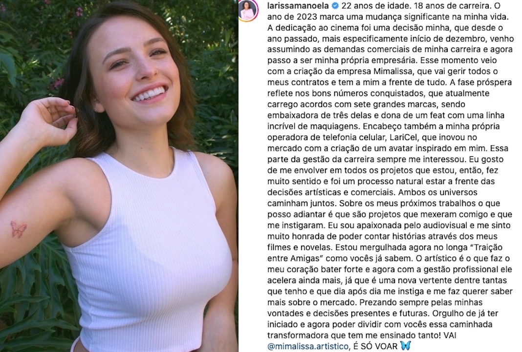 No Instagram, Larissa posou com terno cor-de-rosa, mostrou uma tattoo de borboleta demonstrando transformação, anunciou que decidiu por vontade própria se dedicar ao cinema. Ela anunciou a criação de uma nova empresa de conteúdo artístico, a "Mimalissa".