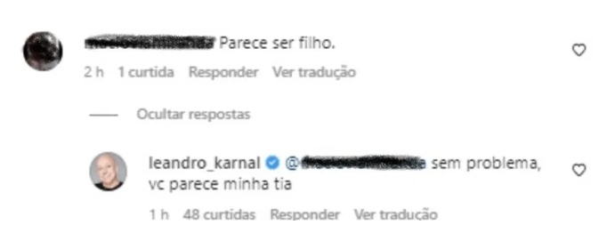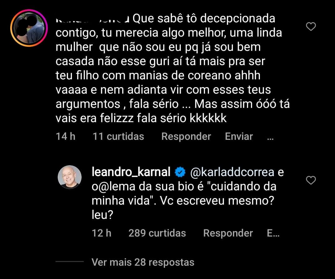 Uma mulher chegou a dizer que Leandro merecia "algo melhor". "Quer saber? Estou decepcionada contigo, tu merecia algo melhor, uma linda mulher, que não sou eu porque já sou bem casada, não esse guri aí, que está mais para ser teu filho", afirmou. "E o lema da sua bio é 'cuidando da minha vida', Você escreveu mesmo? Leu?", respondeu o historiador.