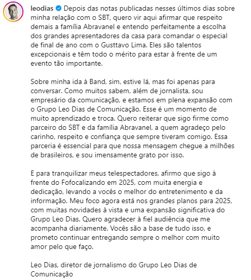 Léo Dias quebrou o silêncio sobre os rumores de insatisfação com o SBT e uma possível ida para a Band. A especulação surgiu após ele supostamente ter ficado chateado por não ter apresentado o especial Natal do Embaixador com Gusttavo Lima, tendo se reunido com a concorrente nesse meio-tempo.