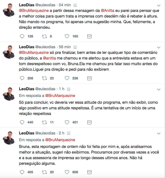 Em resposta diretamente a atriz, Leo negou persegui-la. “Bruna, esta reportagem de ontem não foi feita por mim e, após analisarmos melhor a situação, sugeri não exibirmos. Procuramos por diversas vezes a você e a sua assessoria de imprensa ao longo desses últimos anos. Não há perseguição alguma”.