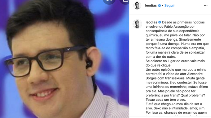 O jornalista acusado por Leo, se manifestou durante o programa “Vida de Artista”: ‘Conversei com a minha advogada, e a gente vai entrar com uma representação contra esse jornalista, por ter usado minha imagem no Instagram dele dentro de um texto completamente mirabolante”, declarou.