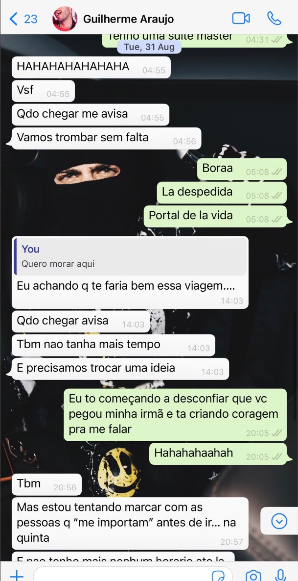 Na conversa, Gui diz que precisa conversar com Leo, que desconfia e dispara: “Eu tô começando a desconfiar que você pegou minha irmã e tá criando coragem para me falar”, escreveu. O amigo respondeu: “[Isso] também”.