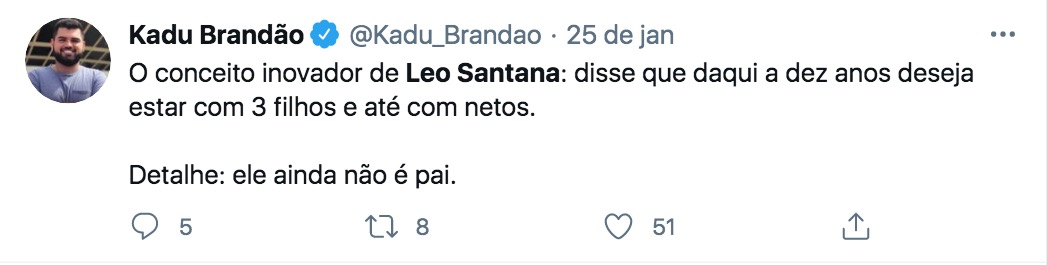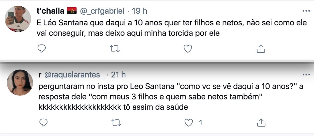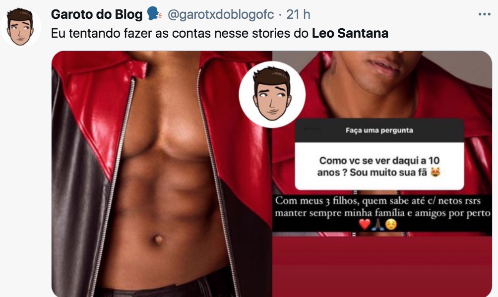 “Perguntaram no insta pro Leo Santana ''como vc se vê daqui a 10 anos?'' a resposta dele ''com meus 3 filhos e quem sabe netos também'' kkkkkkkkkkkkkkkkkkkk tô assim da saúde”, brincou outra.