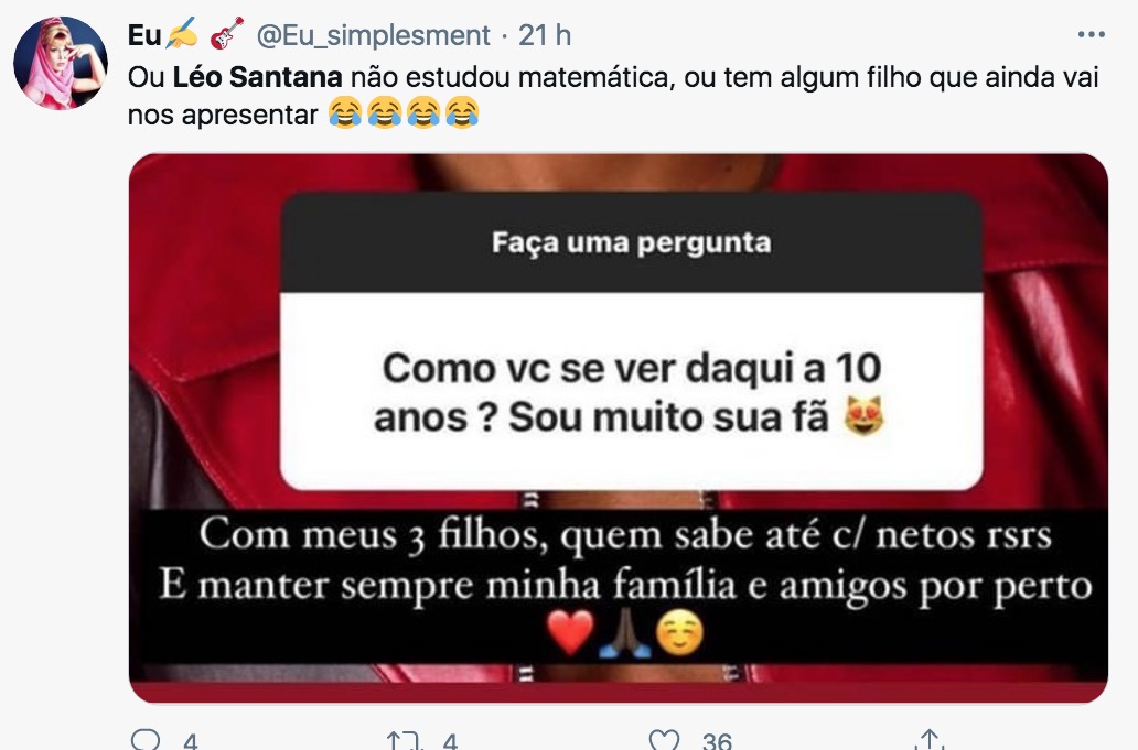 Nas redes sociais, internautas zoaram a resposta do cantor: “E Léo Santana que daqui a 10 anos quer ter filhos e netos, não sei como ele vai conseguir, mas deixo aqui minha torcida por ele”, disse um internauta.