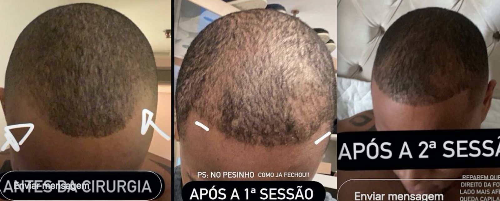 "Fiquei surpreso com a evolução", disse ele, que comemorou o fim das 'entradinhas' na testa. "Fechou-se o pézinho aqui. Ainda tem um pouco de falha porque fiz recentemente", continuou ele, que indicou o procedimento para os demais: