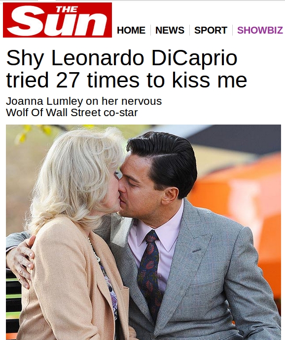 Acostumado a beijar mulheres mais novas, tendo um vasto currículo de 'loiras, magras e altas' na sua vida amorosa, Leonardo DiCaprio teve que refazer vinte e seis vezes uma simples cena de beijo com Joanna Lumley , de 66 anos.