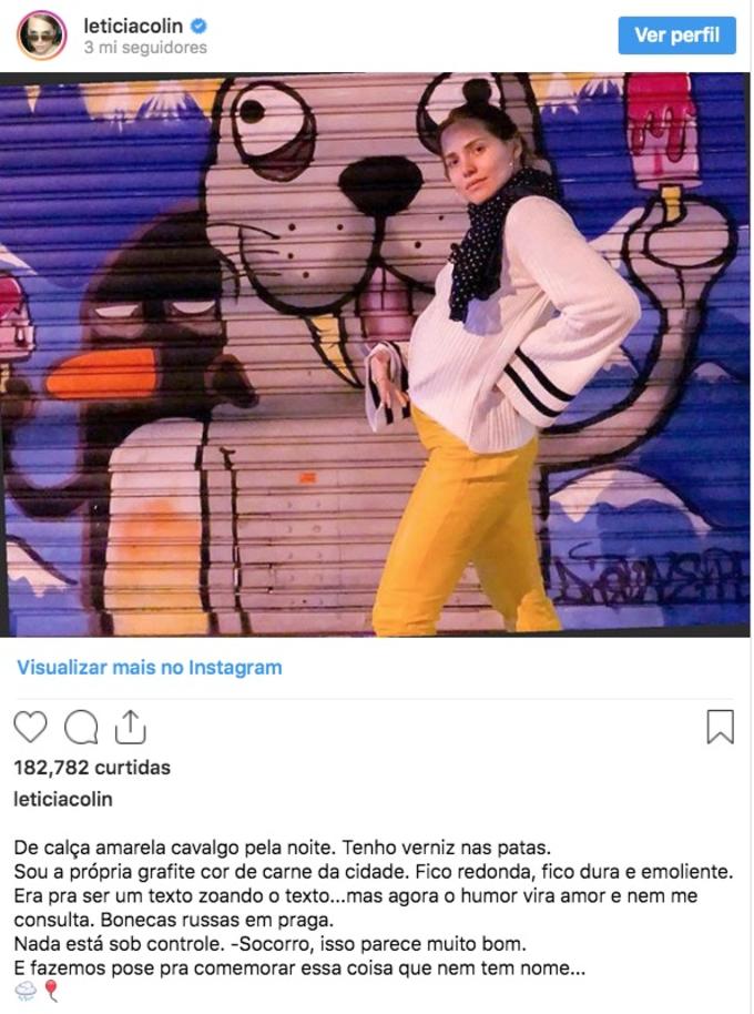 Na foto, a atriz aparece com uma calça amarela e uma barriga saliente. “Era pra ser um texto zoando o texto, mas agora o humor vira amor e nem me consulta. E fazemos pose pra comemorar essa coisa que nem tem nome”, contemplou.