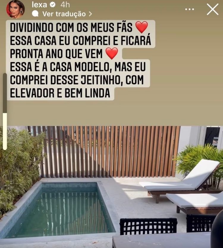 A cantora Lexa revelou, nesta segunda-feira, 24, que comprou uma casa nova. Nas redes sociais, ela posou em frente ao imóvel e explicou que ele ficará pronto no final de 2024.