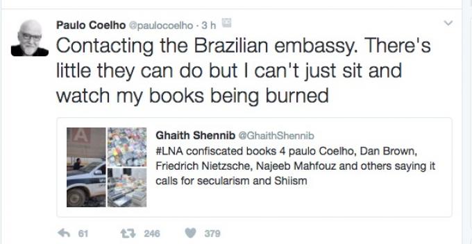 O escritor Paulo Coelho manifestou revolta em publicação feita em seu Twitter. "Contato com a embaixada brasileira. Há pouco que eles podem fazer, mas eu não posso simplesmente sentar e assistir meus livros sendo queimados”.