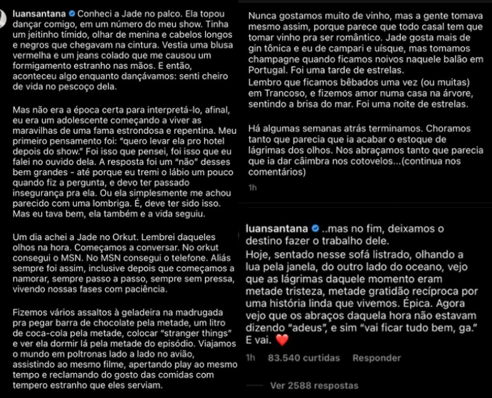 Luan Santana anunciou nesta segunda-feira (19), o término do relacionamento de 12 anos com Jade Magalhães. O cantor publicou em seu instagram um texto falando sobre o fim do noivado.