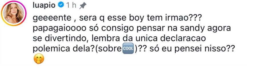 “Gente, será que esse boy tem irmão? Papagaiooo, só consigo pensar na Sandy agora se divertindo. Lembra daquela única declaração polêmica dela? (Sobre ‘cool’). Só eu pensei nisso?” , escreveu Luana em tom irreverente.