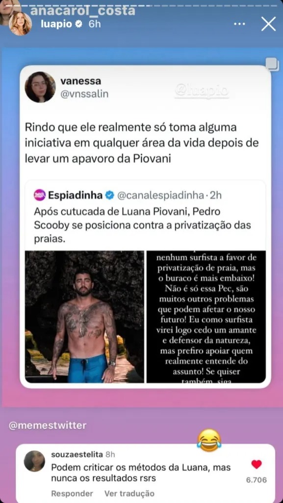 Luana Piovani, 47, compartilhou e reagiu em suas redes sociais à declaração de uma seguidora, nesta segunda-feira (3), sobre o posicionamento de Pedro Scooby, 35, em relação à PEC que quer privatizar praias. Após o surfista dizer que é contra a iniciativa, a atriz riu de alguns comentários na web.