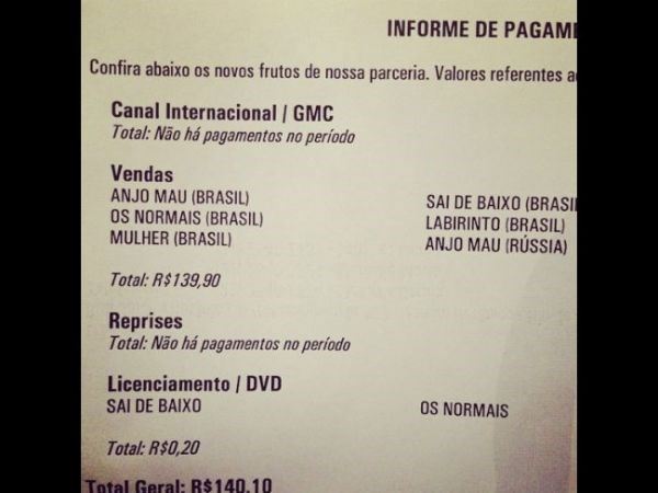 "Não sei se me espanto mais com o ‘Anjo Mau’, que consta aqui e eu não fiz, ou com o valor a ser recebido. Aff. Não vai fazer falta?", alfinetou.