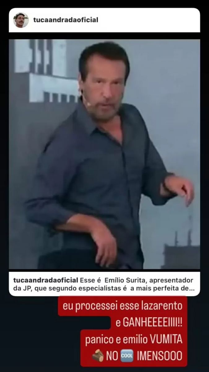 A atriz compartilhou um post sobre o assunto e relembrou quando processou Emílio e o Pânico da TV em 2014. "Processei esse lazarento e ganhei. Pânico e Emílio vomitam. Pau no c* imenso!", detonou.