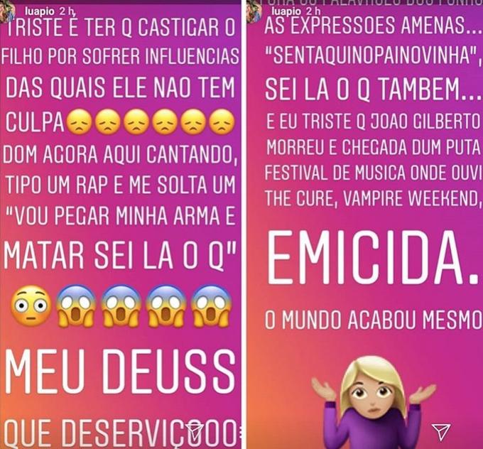 “Triste é ter que castigar o filho por sofrer influências das quais ele não tem culpa. Dom agora aqui cantando tipo um rap me solta um ‘vou pegar minha arma e matar sei lá o que. Meu Deus, que desserviço ”, escreveu. “Fora os palavrões dos funks, as expressões amenas ‘senta aqui no pai novinha’, sei lá o que também. E eu triste que João Gilberto morreu e chegada de um p* festival de música onde ouvi The Cure, Vampire Weekend, Emicida. O mundo acabou mesmo”.