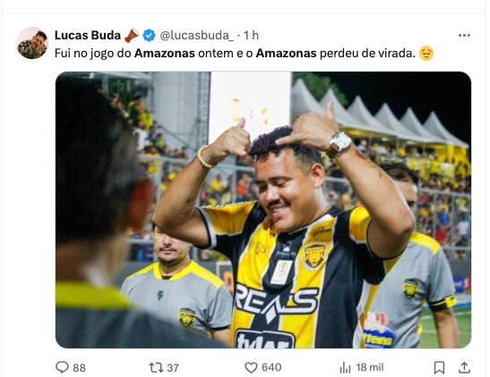 Na rede social X, Lucas comentou a fama de azarão. “Fui no jogo do Amazonas ontem e o Amazonas perdeu de virada”.