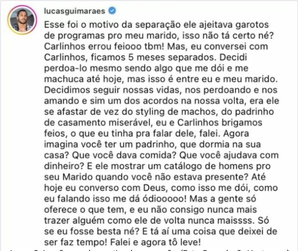 Por falar em Lucas, o influenciador também resolveu soltar o verbo e expôs Farias. "Esse foi o motivo da separação. Ele ajeitava garotos de programa pro meu marido, isso não é certo né? Carlinhos errou feio também! Mas eu conversei com Carlinhos, ficamos 5 meses separados e decidi perdoá-lo".