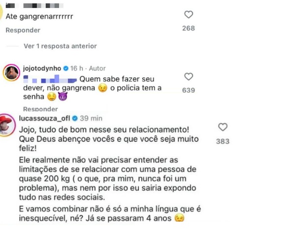 Lucas Souza usou as redes sociais nesta sexta-feira (10) para mandar um recado à ex-esposa, Jojo Todynho, após uma indireta feita por ela nas redes sociais. Após Jojo publicar fotos ao lado do namorado, Thiago Gonçalves, uma internauta fez o comentário "até gangrenar", ao passo que Jojo respondeu: “Quem sabe fazer seu dever, não gangrena. O polícia tem a senha”.