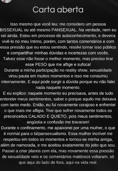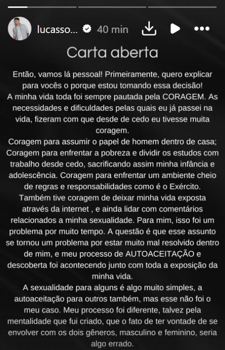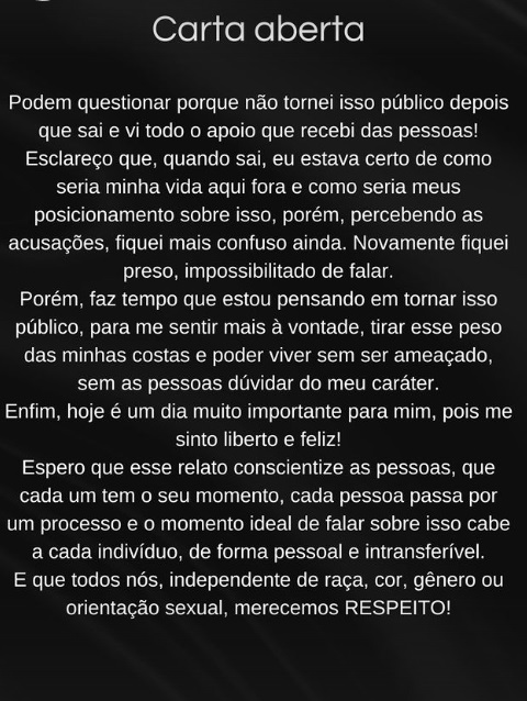 O ex-A Fazenda Lucas Souza, ex-marido de Jojo Todynho, revelou ser pansexual em uma carta aberta publicada neste sábado (27). Leia na íntegra: