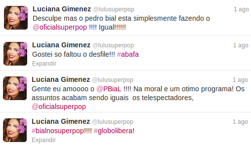A apresentadora do Superpop, luciana Gimenez, usou o twitter para manifestar sua opinião sobre o programa "Na Moral", de Pedro Bial. Luciana disse que o Bial copiou seu programa na última edição quando promoveu um debate com Silas Malafaia, outros religiosos e um ateu.